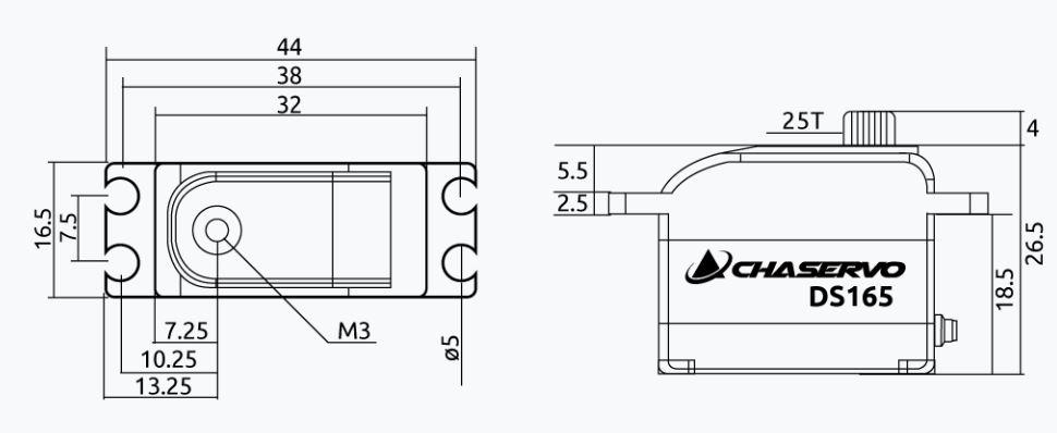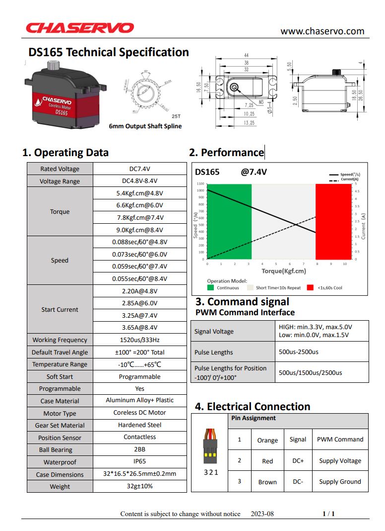 L’ampio intervallo di tensione da 3,3 V a 9 V rende il Chaservo DS165 programmabile un servo a tutto tondo affidabile e versatile con caratteristiche prestazionali impressionanti.